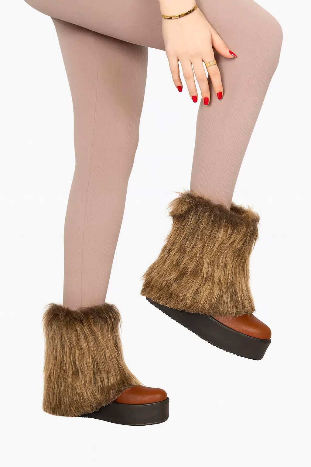 Soğuk kış günlerinde tarzınızı yansıtırken sıcacık kalmanızı sağlayan kahverengi tüylü platform bot; konforu ve şıklığı bir araya getirir; tüylü, peluş detaylı kışlık tasarımıyla dikkat çeker; dayanıklı kalın platform tabanı sayesinde kaymaz ve uzun süreli kullanım sunar; iç kısmındaki yumuşak astar ayağınızı sıcak tutar; suni deri ve yüksek kaliteli suni kürk kombinasyonu ile üretilmiştir; günlük kullanım, şehir yürüyüşleri ve soğuk hava kombinleri için idealdir; spor, bohem ve sokak modasına uygun modern bir görünüme sahiptir; tam kalıptır; etek, tayt veya skinny pantolonlarla mükemmel uyum sağlar; kış kombinlerinize sıra dışı bir dokunuş katar.