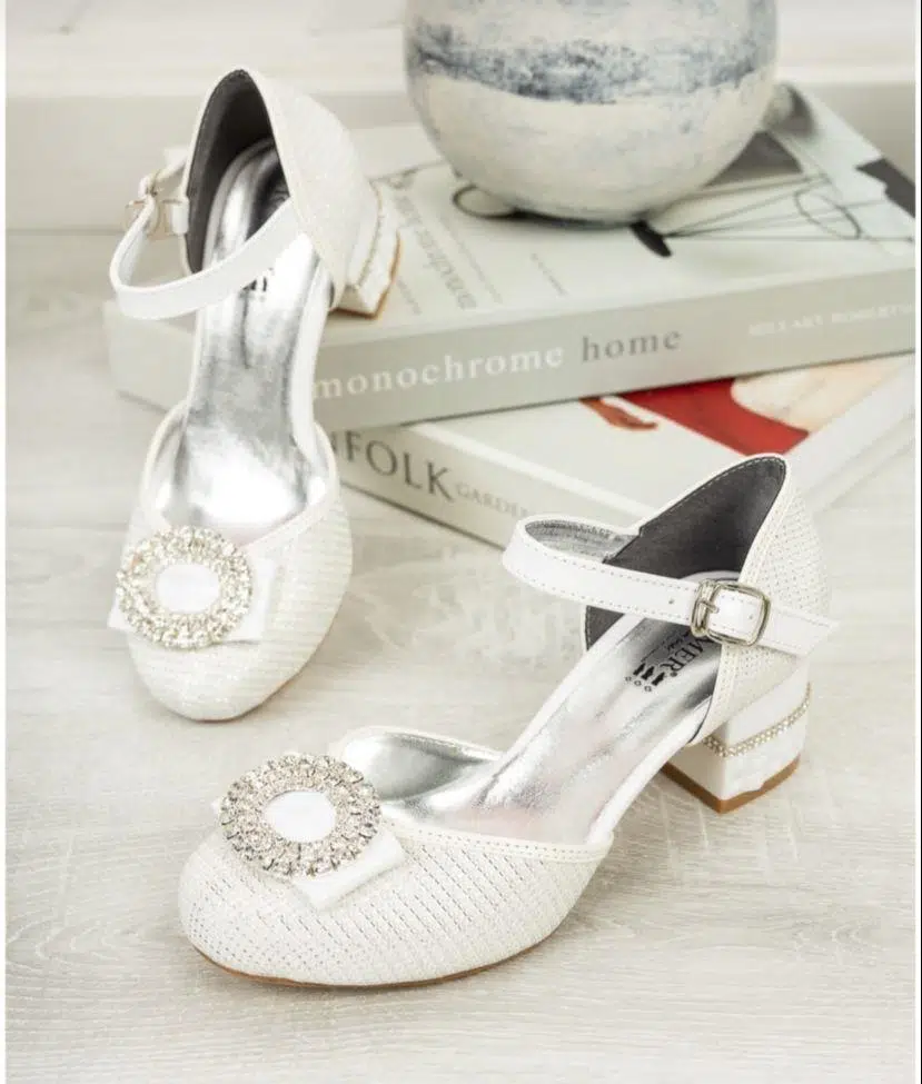 Beyaz Çupra simli taşlı topuklu kız çocuk abiye ayakkbı;